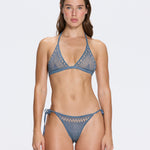 Metallic knit triangle bikini with semi-sheer mesh detailing, Low-Rise Tie-Side Bottom, Delicate Sheer Panels, Lightweight and sculpting fit, Fully lined for comfort, Italian Yarn