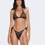 Metallic knit triangle bikini with semi-sheer mesh detailing, Adjustable Neck and Back Ties, Delicate Sheer Panels, Lightweight and sculpting fit, Fully lined for comfort, Italian Yarn