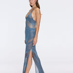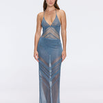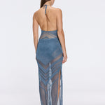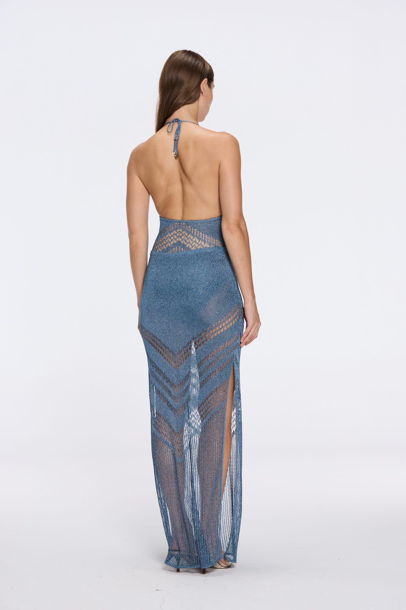 Sheer metallic knit fabric, High-rise fit, Elastic waistband, Straight cut silhouette, Full-length maxi style, Semi-stretch, lightweight texture