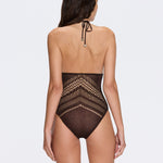 Metallic knit triangle bikini with semi-sheer mesh detailing, Adjustable Neck and Back Ties, Low-Rise Tie-Side Bottom, Delicate Sheer Panels, Lightweight and sculpting fit, Fully lined for comfort, Italian Yarn